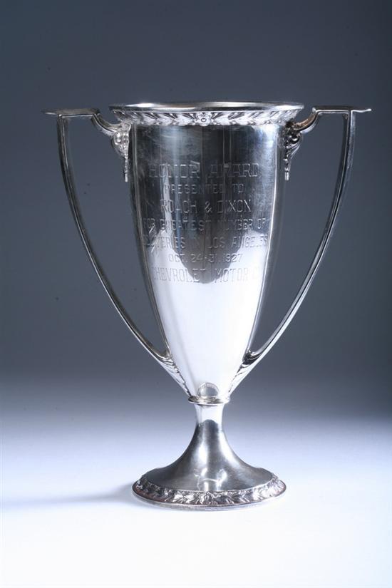 GORHAM STERLING SILVER TROPHY VASE.Circa 1926. Of typical form, inscribed "Honor Award Presented To Roach & Dixon For Greatest Number Of Deliveries In Los Angeles Oct. 24-31, 1927 Chevrolet Motor Co" - 22 oz., 8 dwt.; 11 in. high.