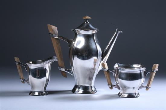FOUR-PIECE WILCOX SILVER PLATED COFFEE SERVICE.late 19th century; pattern 4056. In the Arts and Crafts taste. Comprising coffee pot, creamer, sugar and serving tray; each with wood handles - 8 1/2 in. high, coffee pot.