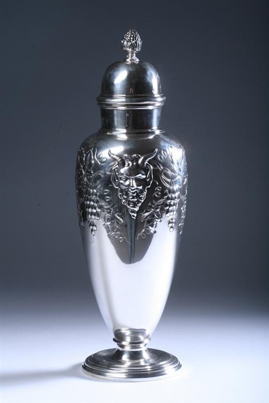 INTERNATIONAL STERLING SILVER POTPOURRI VASE.pattern 42C, 4 pint capacity. Oviform, on circular foot; pierced interior cover; one side with repoussé grapevines and applied satyr masque - 29 oz., 2 dwt.; 15 1/4 in. high.