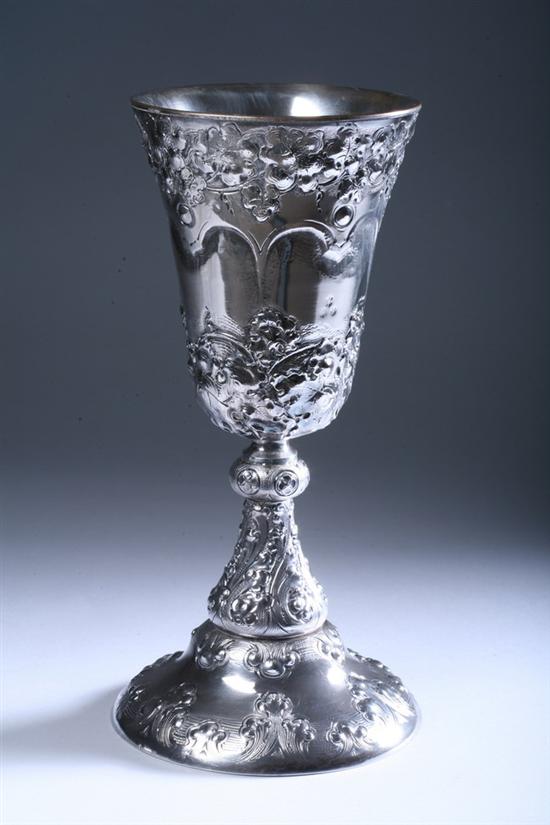GERMAN SILVER CHALICE.late 19th century, Hanau pseudo marks. Spreading circular foot and baluster-form standard with cartouche and acanthus decoration; supporting flaring well, decorated with viney branches; weighted - 13 1/2 in. high.