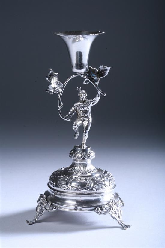 WHIMSICAL CONTINENTAL SILVER FIGURAL CANDLESTICK.early 20th century. Circular foot raised on three scrolling feet, figural standard of man in lederhosen, holding leafy vine, supporting urn-form nozzle - 4 oz., 4 dwt.; 7 1/2 in. high.