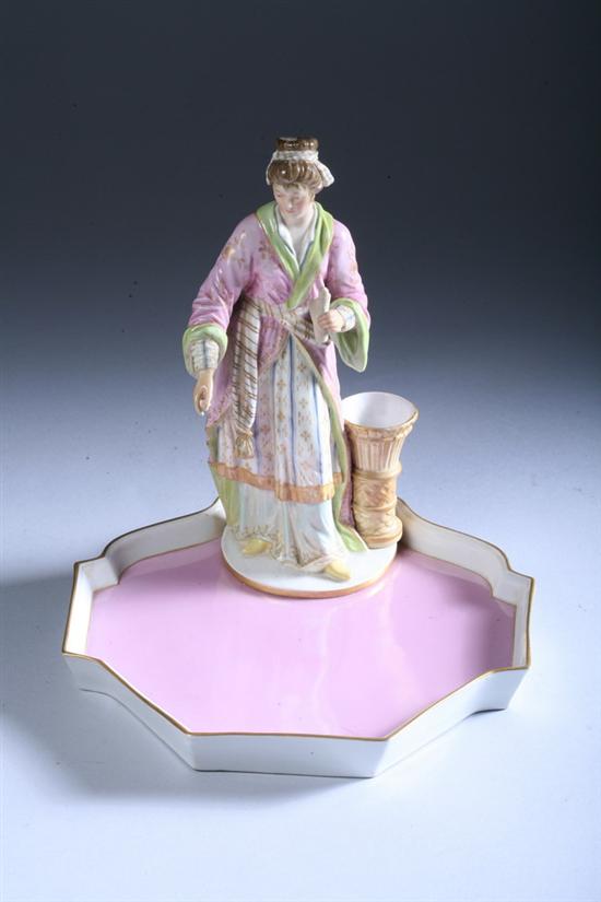 KPM PORCELAIN FIGURAL SERVING DISH,Late 19th- early 20th century. Polychrome glazed figure of a female with attached undertray. - 10 in. high x 9 in. long.