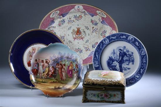 FIVE PIECES ENGLISH AND CONTINENTAL PORCELAIN AND CERAMICS. Including a Samson porcelain armorial platter, an Austrian porcelain cabinet plate depicting classical beauties, a continental ceramic cabinet plate with cobalt boarder and depicting classical beauties, a wedgwood Ivanhoe cabinet plate, and a French porcelain jewel box, the box with hand-painted decoration on all sides, the lid with hand-painted scene of a maiden with putto, signed A. Collut. - 18 1/4 x 14 1/4, Samson platter; 4 1/2 x 9 x 9 in, box.