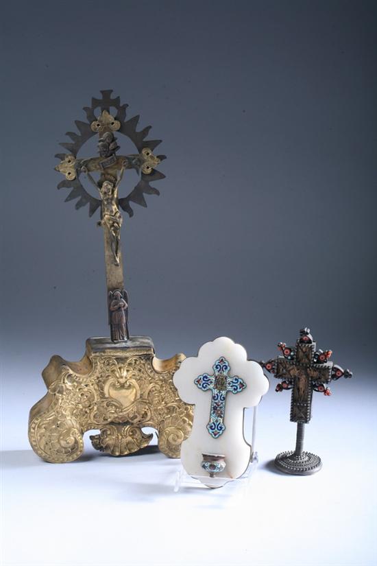 THREE RELIGIOUS ITEMS. Including a gilt metal crucifix on stand, a French alabaster and champleve enameled holy water font, and an embelished silver mounted wood crucifix. - 18 3/4 in high (tallest).