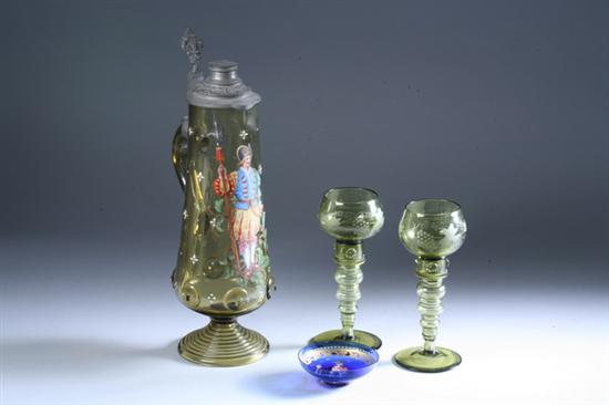 GERMAN ENAMELLED GLASS HISTORISMUS EWER,Late 19th century. Green glass decorated with enameled historical figure, pewter cover. Together with pair German green glass goblets and an enameled cobalt glass bowl. - 15 1/2 in. high over all.