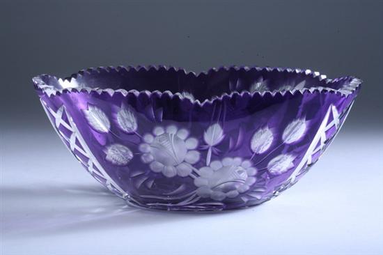 Sale 44 Lot 1058 BOHEMIAN AMETHYST CUT-TO-CLEAR GLASS CENTERBOWL, 20th century. - 4 1/4 x 11 3/4 in. PROVENANCE: Estate of Psychic Jeane Dixon, Washington, DC Estimate $75-125 PROVENANCE: Estate of psychic Jeane Dixon, Washington, DC In overall excellent condition - fleabites to some points along the sawtooth rim but nothing significant. No repairs. Sold for $300