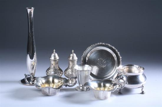 SEVEN PIECES AMERICAN STERLING SILVER HOLLOWWARE. Including a Wallace cup engraved "Jimmy Dixon"; International creamer and sugar, gilt interior, beaded edge; Reed & Barton sugar, "Mayflower" pattern, circa 1940; Reed & Barton salt and pepper casters, "Francis I" pattern, circa 1950; sterling bud vase, weighted - 22 oz., weighable silver; 4 1/2 in. high, casters.
