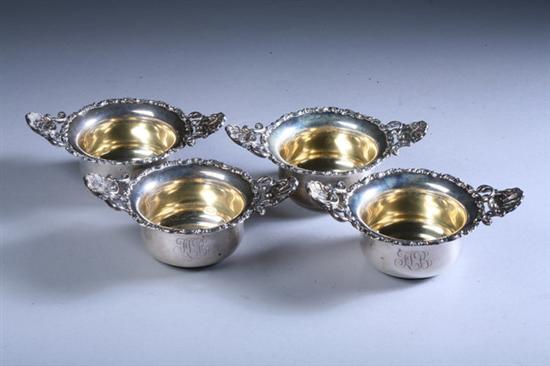 TEN MAUSER STERLING SILVER BOUILLON BOWLS,Circa 1900, pattern 5701. Circular with gilt interior; scrolling border, shell-form handles; 'FLB' monogram - 26 oz., 5 dwt.; 1 1/2 in. high x 3 1/2 in. diam.