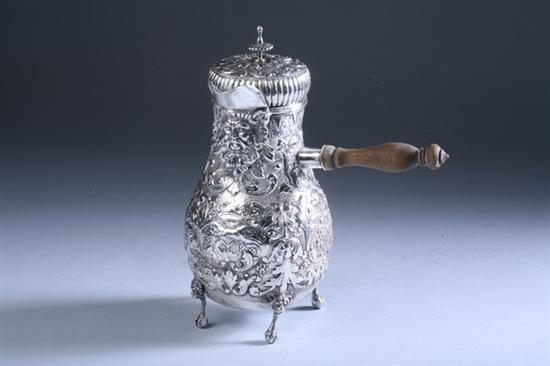 GERMAN SILVER REPOUSSÉ CHOCOLATE POT.late 19th century, Hanau pseudo marks, 800 silver standard. Oviform, on four ball and claw feet; with scrolling foliate decoration allover; applied masque head spout; wood handle - 11 oz., 8 dwt., total weight; 8 1/2 in. high.