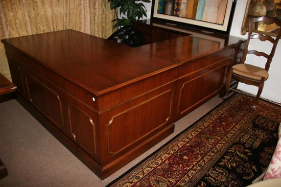 GEORGIAN STYLE MAHOGANY RECEPTIONIST DESK, 20th Century, with brass bail-pull handles. Wrap-around three-sided form; enclosed by molded-edge panel-enriched exterior Estimate $400-600