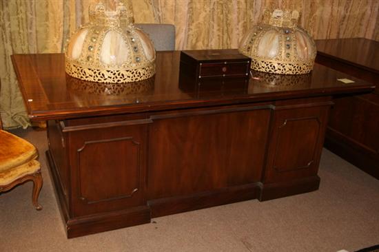 GEORGIAN STYLE MAHOGANY DOUBLE PEDESTAL DESK, 20th Century, with brass bail-pull handles. Projecting inlaid molded-edge top; over three aligned frieze drawers; with three drawer pedestals; and front courtesy panel Estimate $500-700