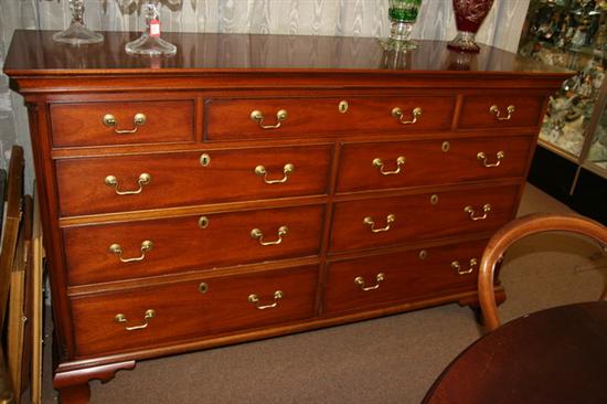 FEDERAL STYLE MAHOGANY CHEST OF DRAWERS , Late 20th Century with brass bail-pull handles. Cove-molded frieze, with three aligned drawers; over two banks with three drawers each; on ogee bracket feet Estimate $450-550