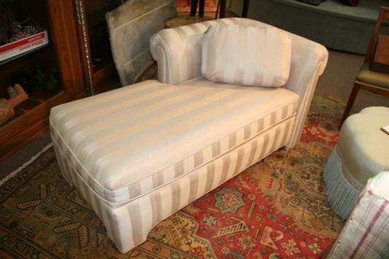 CONTEMPORARY PETITE CHAISE LONGUE, Late 20th Century with cream wide-striped upholstery. RIght corner with rolled back and side support; small loose cushion; attached seat cushion; and extended upholstered post feet Estimate $350-550