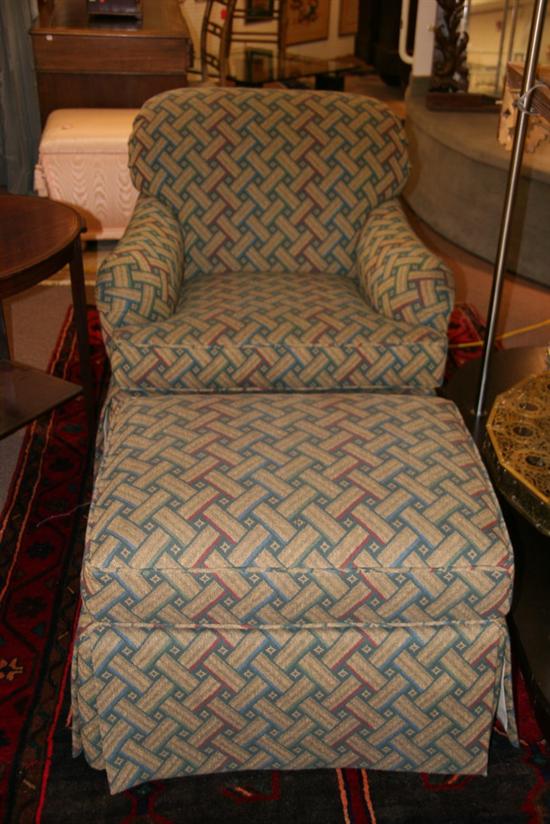 CONTEMPORARY CLUB CHAIR WITH OTTOMAN, Late 20th Century. Baker Furniture thick pleat-wrapped back; similar arms; loose seat cushion; box-pleated skirt with similar leg rest Estimate $400-600