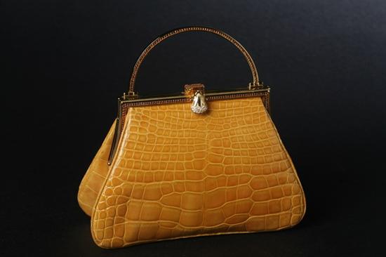 JUDITH LEIBER OCHRE ALLIGATOR HANDBAG. Triangular; with rhinestone inlaid gold-tone mount and clasp; matching satin interior; optional shoulder chain. Includes satin coin purse, mirror, comb and dustbag - 4 3/4 in. x 7 1/4 in. x 2 in. Estimate $700-1,000
