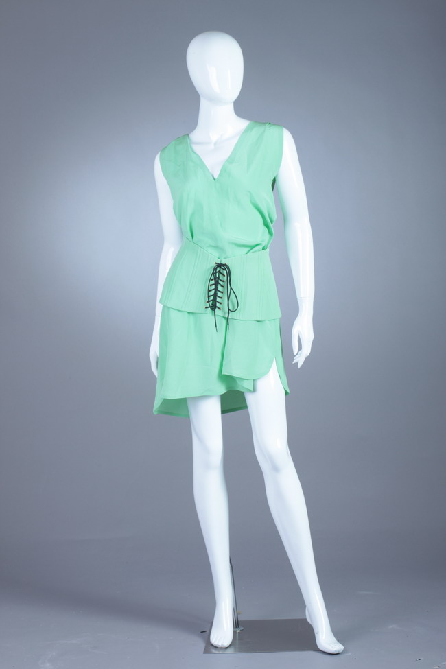 Sale 78 Lot 249 CHANEL MINT GREEN SILK DRESS AND CORSET BELT. Printemps 1994; size 42; retailed Saks Jandel, Chevy Chase, Washington, DC. A-line sleeveless dress, with wide corset belt Estimate $250-350 Unsold