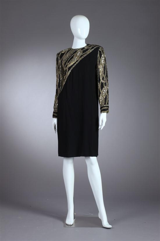 BOB MACKIE EMBELLISHED BLACK EVENING DRESS, 1980s; retailed Elizabeth Arden. Columnar; the bodice and sleeves with gold, silver and black beaded and sequined decoration; the back with faux wrap panel that connects at the shoulder Estimate $75-150