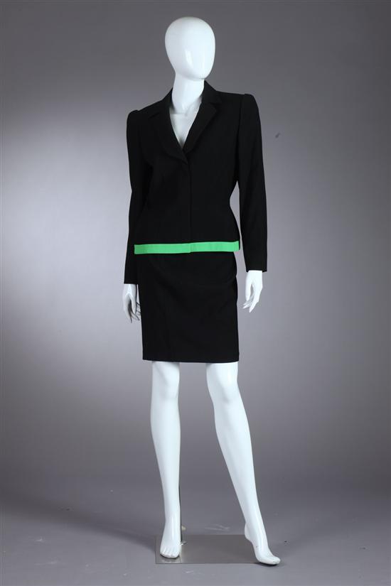 THIERRY MUGLER BLACK WOOL SUIT, 1980s; Size 42. Single-breasted box cut jacket, with lime green border; knee-length skirt Estimate $100-200