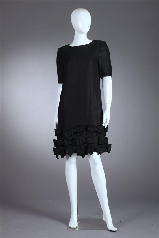 WILLIAM PEARSON BLACK LINEN DRESS, Size 8; retailed Razook's. Shift dress; featuring several applied black bows along the hemline Estimate $75-150