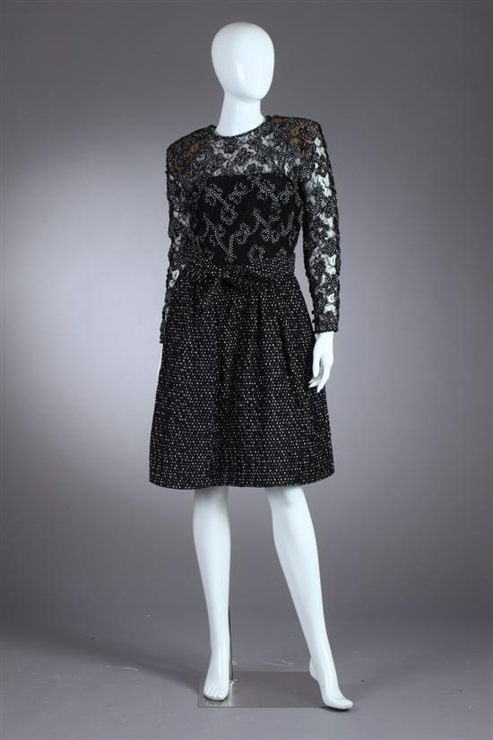 STANLEY PLATOS - MARTIN ROSS BLACK COCKTAIL DRESS,Size 8; retailed Rizik Bros., Washington, DC. Black ground with white polka dots; the skirt and belt in a tightly pleated textured material; the black lace bodice, with soutache; black silk lining Estimate $100-200