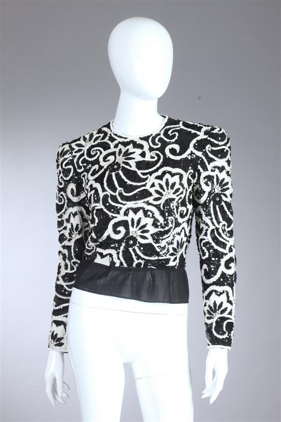 RICHILENE BLACK AND WHITE EMBELLISHED EVENING TOP, Retailed Elizabeth Arden. The sequined pattern highlighted with silk embroidery, beading, faux seed pearls and colorless rhinestones; black chiffon ruffled hem Estimate $75-100