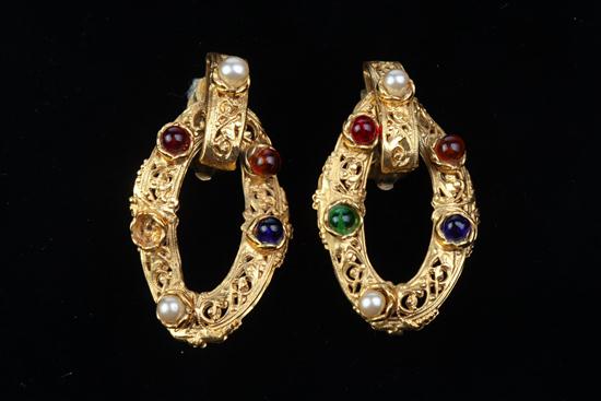 PAIR CHANEL GOLD-TONE GRIPOIX PENDANT EARRINGS. late 1980s; designed by Victoire de Castellane, collection 26. Oval openwork, set with polychrome gripoix and faux pearls; 2 1/4 in. x 1 1/8 in. With box Estimate $200-400