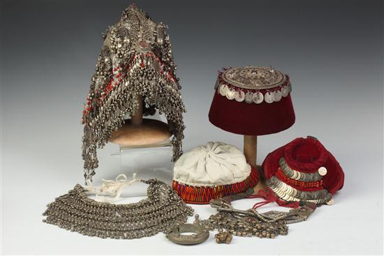 COLLECTION MIDDLE EASTERN AND INDIAN ACCESSORIES. Including two Palestinian wedding hats, Indian headdress, two necklaces, ring and bracelet Estimate $100-150