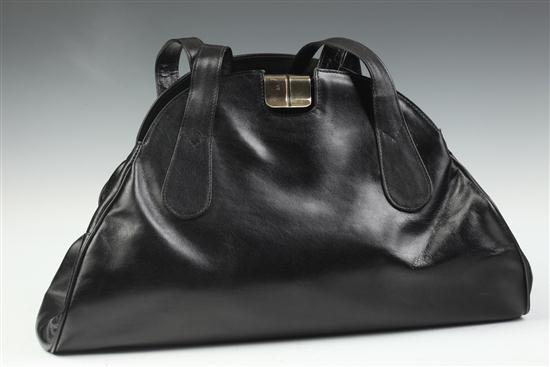 GARFINCKEL'S BLACK LEATHER HANDBAG, Made in Italy. Demilune; the black leather interior with divided compartments and pockets - 10 1/2 in. x 17 1/2 in. x 4 1/2 in. Estimate $75-125 PROVENANCE: Estate of Emma Liu, Chevy Chase, Md