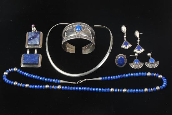 GROUP STERLING SILVER AND LAPIS JEWELRY. Including choker with two pendants, beaded necklace, cuff bracelet, ring and two pairs earrings Estimate $300-400 PROVENANCE: Estate of Emma Liu, Chevy Chase, Md