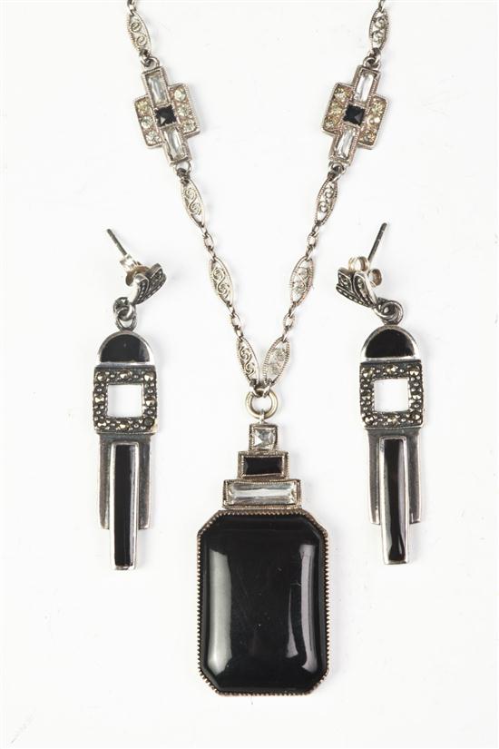 ART DECO STERLING SILVER, ONYX AND MARCASITE NECKLACE WITH EARRINGS. Necklace also set with colorless rhinestone, 18 1/2 in. long; similar earrings, 1 3/4 in. long Estimate $200-300 PROVENANCE: Estate of Emma Liu, Chevy Chase, Md The necklace is missing one rhinestone.