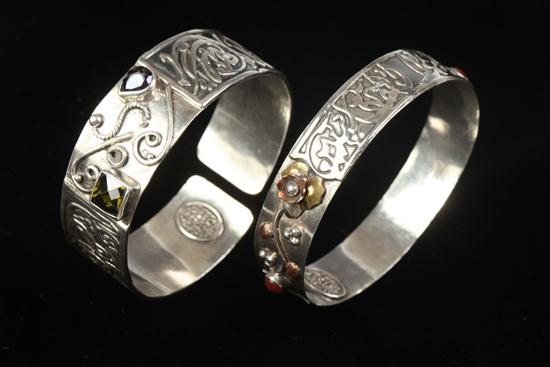 TWO STERLING SILVER BANGLE BRACELETS. Each with applied scrolling decoration; one set with carnelian, one with faceted peridot and amethyst - 1 oz., 8 dwt., total weight. Estimate $150-250 PROVENANCE: Estate of Emma Liu, Chevy Chase, Md