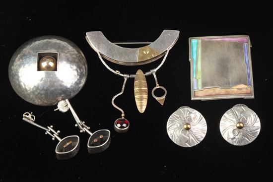 COLLECTION STERLING SILVER STUDIO JEWELRY. Including Sydney Lynch silver gilt and garnet brooch; Baharal-Gnida silver gilt brooch; Steve Stamas silver gilt earrings; Carly Wright enamelled brooch; BG Steck earrings - 2 1/2 in. high, largest. Estimate $200-300