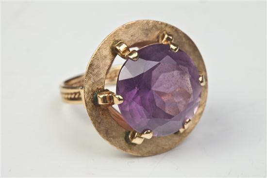 14K YELLOW GOLD AND AMETHYST CONTEMPORARY DESIGN RING. Round amethyst weighing approx. 8.00 ct. raised by six prongs in round, florentined gold setting. Size: 6 Estimate $150-200