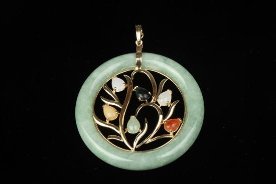 14K YELLOW GOLD MOUNTED CHINESE JADE MEDALLION PENDANT. Tubular celadon jade ring centers gold openwork branch motif with six various color pear shape jade cabochons. D: 2" Estimate $100-150