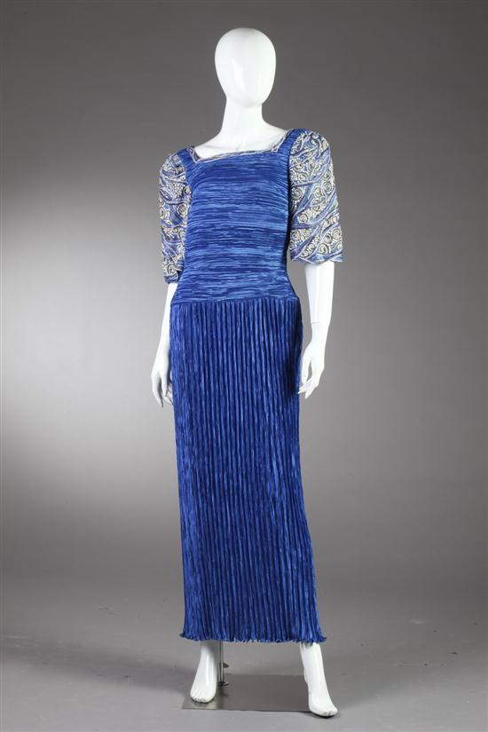 MARY MCFADDEN COUTURE COBALT BLUE EVENING DRESS. The columnar gown in the signature pleating; the sleeves heavily embellished in blue and white beading Estimate $200-400 In overall excellent condition - without holes, tears, stains or odors.