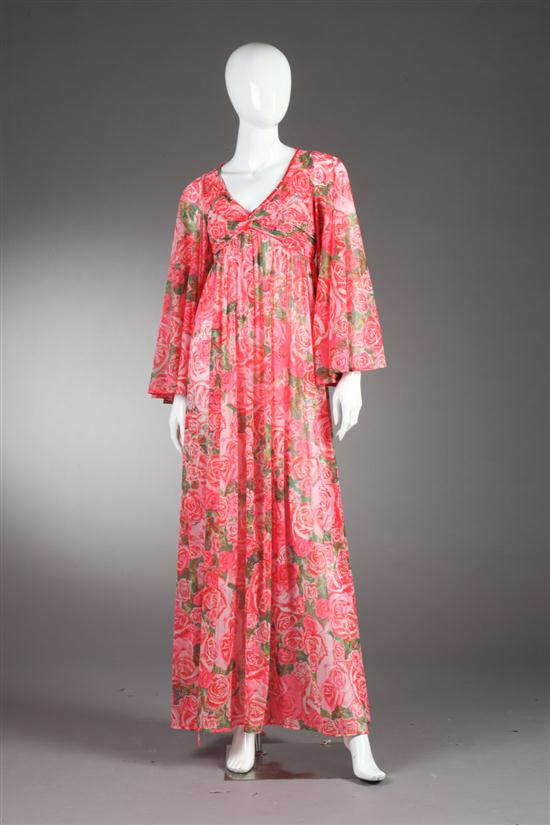 ROBERT-DAVID MORTON PINK ROSE PRINT DRESS, 1970s; size 6. Cross-over Empire bodice, bell sleeves Estimate $150-250