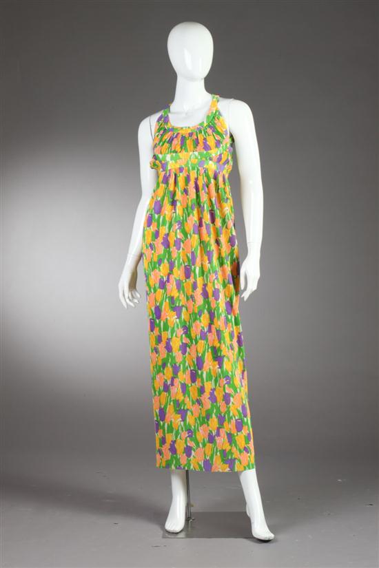 Sale 78 Lot 77 ROBERT-DAVID MORTON FLORAL PRINT HALTER DRESS, 1970s. In a vivid green, yellow, pink and purple print of tulips Estimate $150-250 In overall excellent condition - without stains, holes or odors. Sold for $100