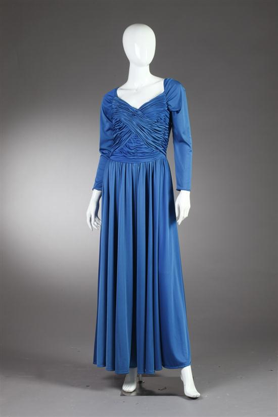 ROBERT-DAVID MORTON COBALT BLUE DRESS, 1970s; size 14. Pleated cross-over bodice, the inside fitted with stays Estimate $100-200 There is a small faint stain on the front and back of the skirt. There are three tears along the waist seam that need to be restitched.