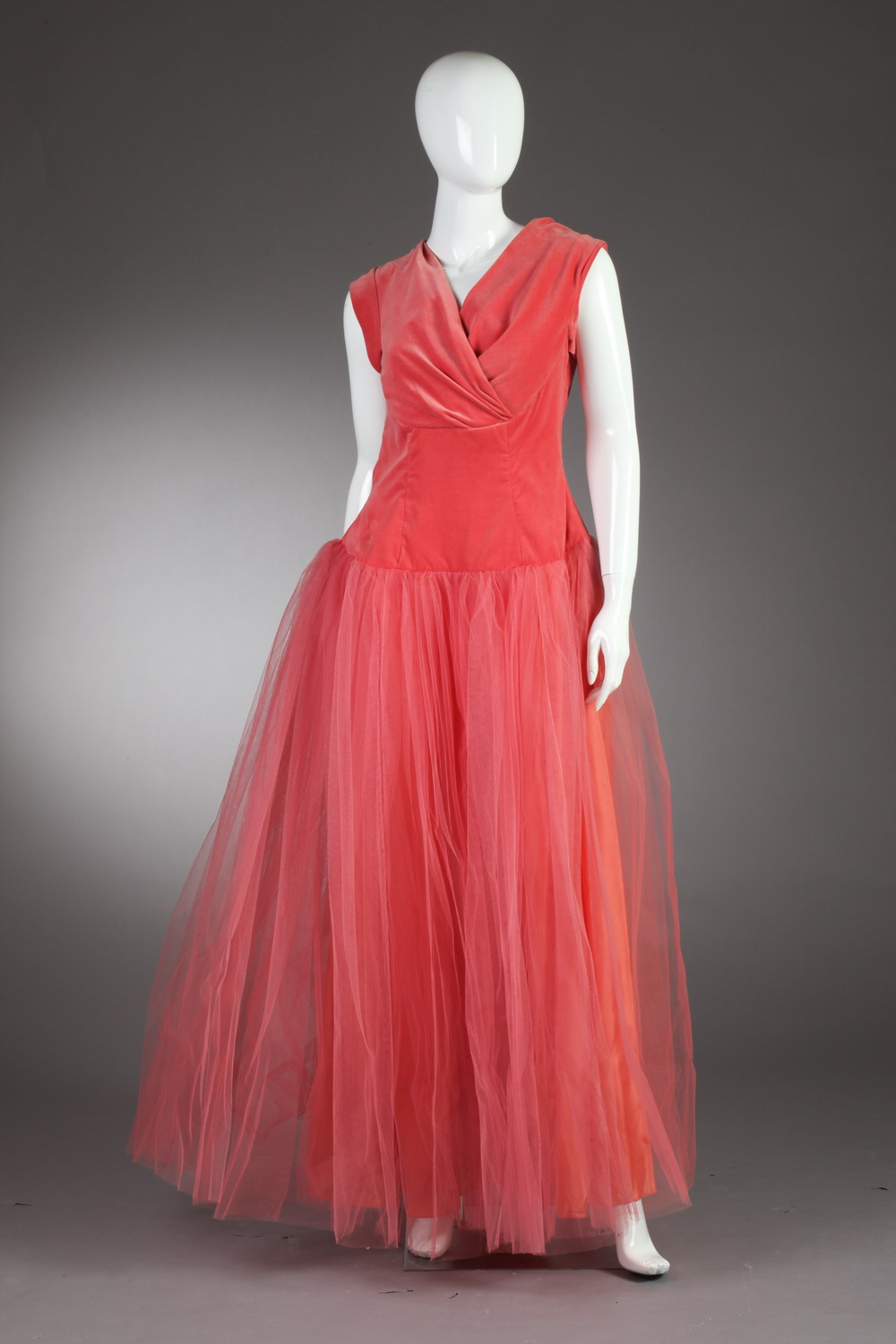 Sale 78 Lot 97 PINK VELVET AND TULLE GOWN, Retailed Rike's, Dayton, Ohio. Gently draped sleeveless cross-over bodice, with drop waist Estimate $50-75 In overall good condition - without stains or holes; odor free. A small area of tulle has separated at the back along the waist seam. Unsold