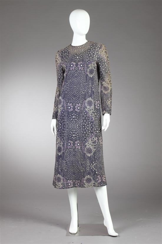 STÉPHOY CRÉATIONS PURPLE AND GOLD METALLIC DRESS.23-25, Fbg. St. Honoré, Paris. In allover floral print; blue slip lining Estimate $100-200