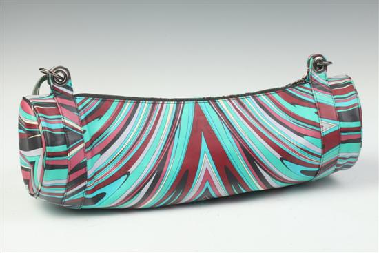 EMILIO PUCCI LEATHER HANDBAG, Signed within design. Cylindrical; in signature polychrome geometric pattern; the shoulder strap with enamelled hardware - 4 in. x 14 in. Estimate $200-300