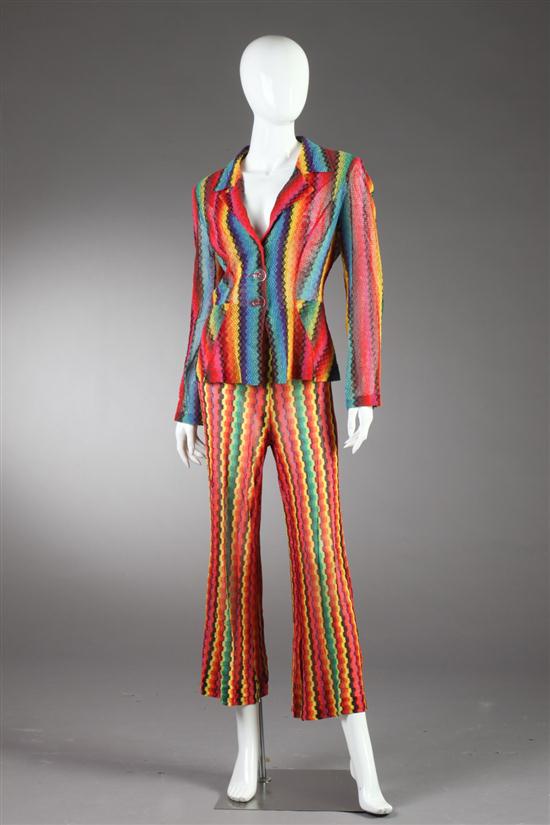 Sale 78 Lot 81 MISSONI ZIG ZAG CROCHET PANTSUIT, 1980s. In vibrant primary colors. Comprising cotton blend single-breasted jacket and nylon pants Estimate $300-400 In overall excellent condition - without holes, stains, snags or odors. Sold for $190