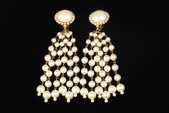 CHANEL FAUX PEARL AND RHINESTONE DROP EARRINGS, 1980s. Gold-tone settings; faux pearl button, surrounded by colorless rhinestones; suspending six strands graduated faux pearls - 1 in. diam. x 4 1/2 in. long. Estimate $300-400