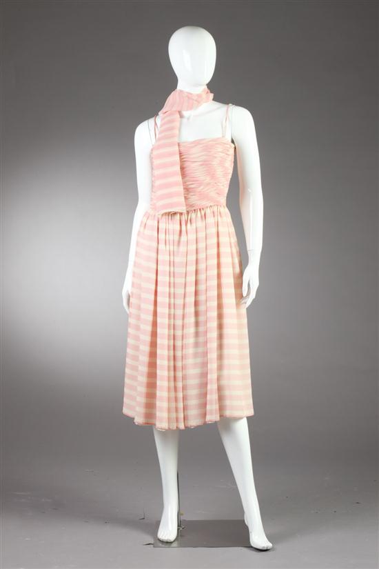 MISS O BY OSCAR DE LA RENTA PINK AND CREAM STRIPED SILK DRESS AND SCARF, Mid-1980s; size 6. Pleated bodice, with layered skirt; spaghetti straps Estimate $200-300