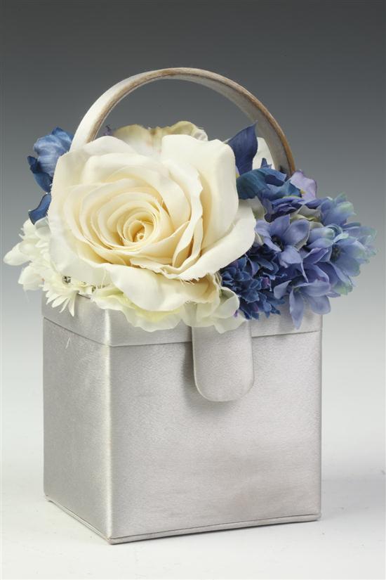 MOO ROO HANDBAG. Mary Norton signature and dated May 25, 2003. Grey silk box-form bag; the cover with applied flowers - 4 1/4 in. x 4 1/4 in. x 3 1/2 in. Estimate $75-100