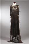 BEADED BROWN SILK AND CHIFFON EVENING DRESS,Circa 1919; Worth Roberts, 12 East 48th St., New York label. Ankle-length brown silk underdress, with heavily black beaded chiffon overdress, and long back panel Estimate $200-300