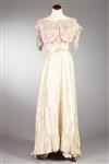 EDWARDIAN CREAM AND PINK SILK BODICE AND SKIRT, Circa 1900; Moore, 54 East 49th St., New York label. Bodice with lace neckline, with pink net overlayer, trimmed with ribbon and rosettes; hidden underskirt of cream lace and pink silk netting, also with rosettes, the overskirt with pleated hemline