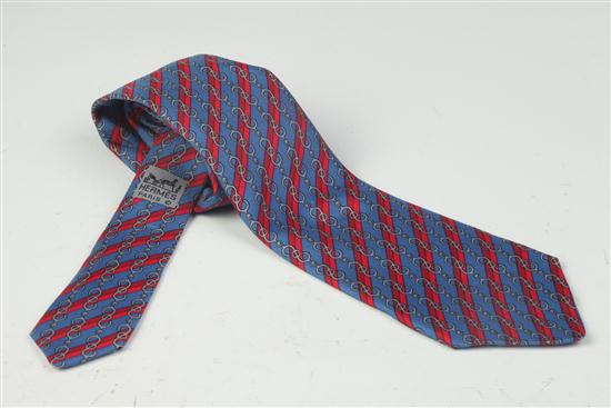HERMÈS SILK TIE, No. 7223 UA. Blue ground with red stripes and grey pattern; original box Estimate $100-150