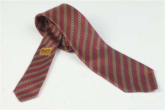 HERMÈS SILK TIE, No. 7073 TA. Burgundy ground with yellow and blue pattern; original box Estimate $100-150