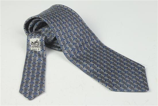 HERMÈS SILK TIE, No. 7824 UA. Blue ground with silver pattern; original box Estimate $100-150